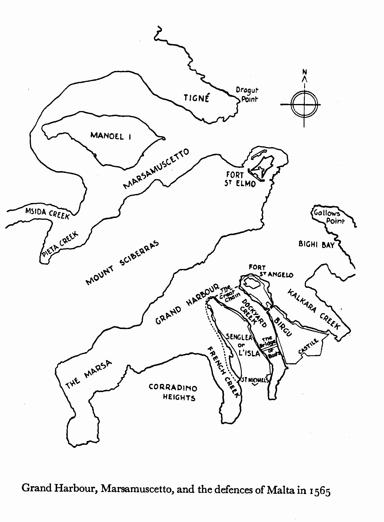 The top left photo is of Fort St Angelo, taken from Valletta, with the town of Birgu in the rear. They form a peninsula jutting out into Grand Harbour. The top right photo of French Creek shows some of the town of Senglea, also on a peninsula. Between the two peninsulas lies what is known as Dockyard Creek. This was where the great siege took place in 1565. The Knights of Malta fortified the necks of land at the end of these peninsulas, with Fort St Angelo as the strong point. A chain was fitted across the entrance and a bridge of boats from Birgu to Senglea enabled the Knights to reinforce whichever side was in most need. At that time Valletta had not been built, only Fort St Elmo, which protected Grand Harbour entrance. The diagram, right, shows the situation at that time. The Turks tried for three months to capture the place and when they retreated it was in ruins. La Valette, the Grand Master of the Order, realised that the place could not stand another siege, so he immediately started to build the town named after him, the present day Valletta, on the Mount Sciberras of the diagram. At a later date it was deemed necessary to strengthen the fortifications and more were built at Floriana, outside the original walls.; Floriana can be seen in the bottom left photo and in the space between the two can be seen the circular shapes of the granaries, which were certainly in use up to the second world war. |