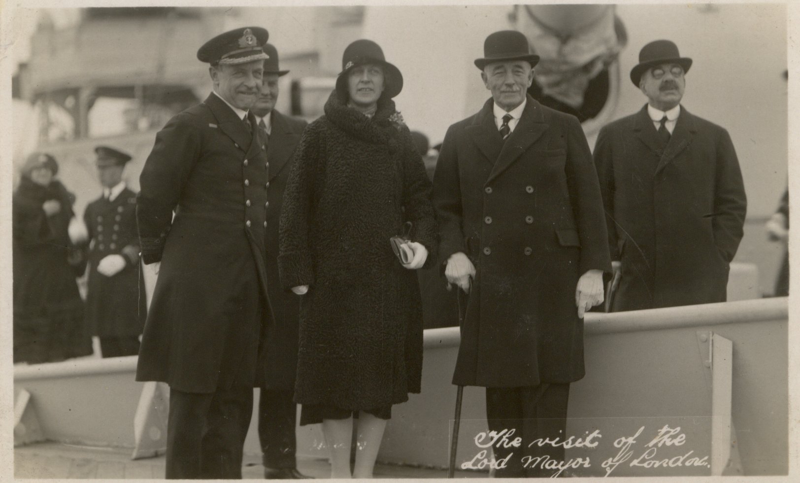 Shows HMS London moored in the middle of the river at Gravesend, dressed overall. There is also a picture of the Lord Mayor and Lady Mayoress of London, Lord and Lady Ebbisham, who visited the ship on 16th March 1929. The ship's company marched past and the visitors had tea on board, before leaving at about 6 o'clock. The Lord Mayor asked for the main brace to be spliced as he left, which made him very popular with the ship's company. The other picture of interest is that of Stanley Baldwin, the Prime Minister, who came on board for breakfast on 18th March, rather late apparently because the weather was foggy. When the fog lifted a party of 20 officers and 200 men left the ship and marched through the streets of London, through cheering crowds, to a party at the Guildhall. At this party, apparently, every member of the ship's company was presented with a souvenir cigarette case (see Bow Bells pages xiv-xv). I wonder if this was the case being shown to baby Alfred in the photograph taken on Southsea Common in 1932.