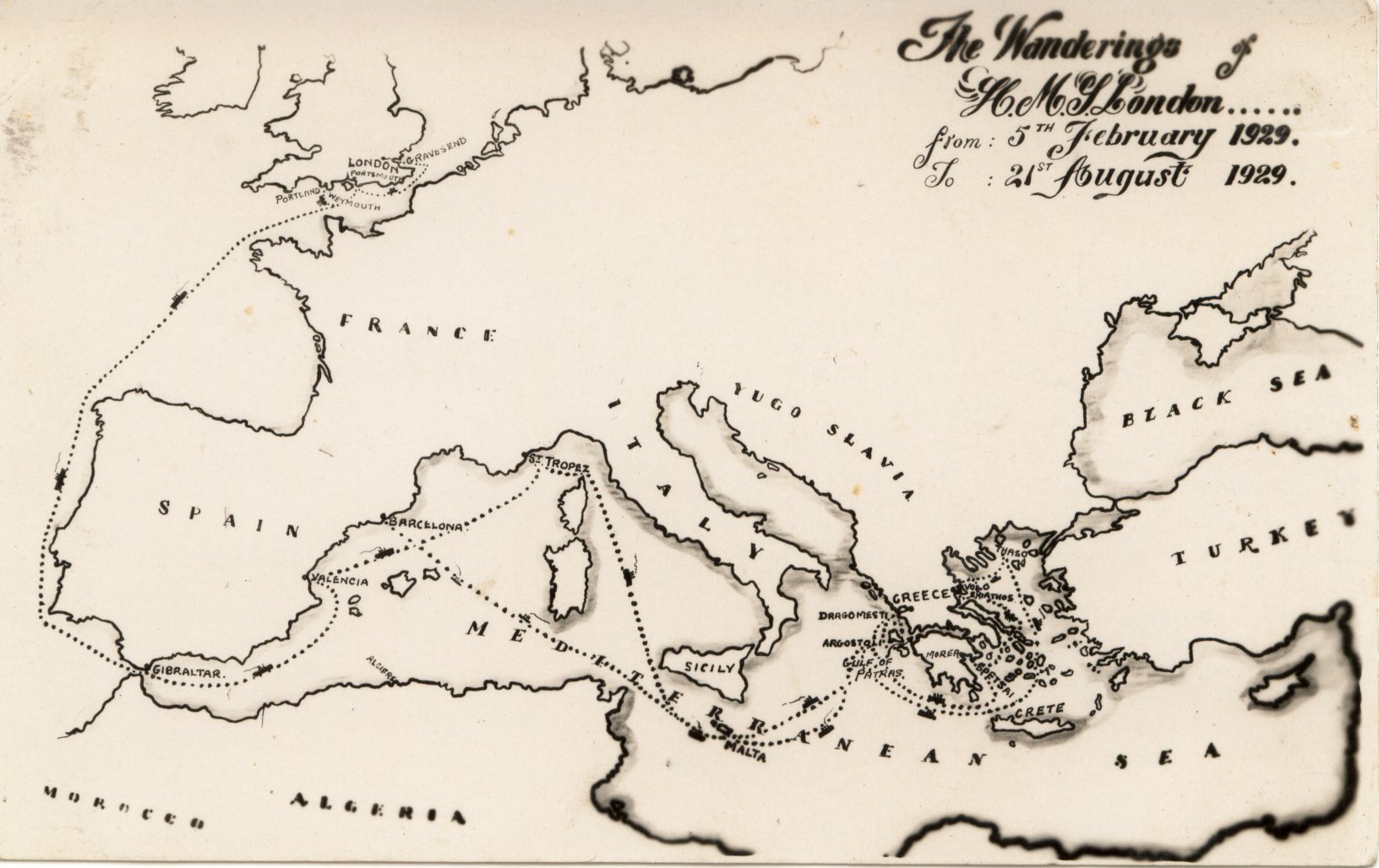Shows pictures of some of the visits made during the fleet's summer cruise of 1929. HMS London left Malta with the fleet for the Gulf of Patros on 26th June. The ship actually visited more places than are shown here, all of them in Greece. The first was Dragomesti, the next Spetzia. The first three pictures here are of Spetzia. The next visit was Volo.