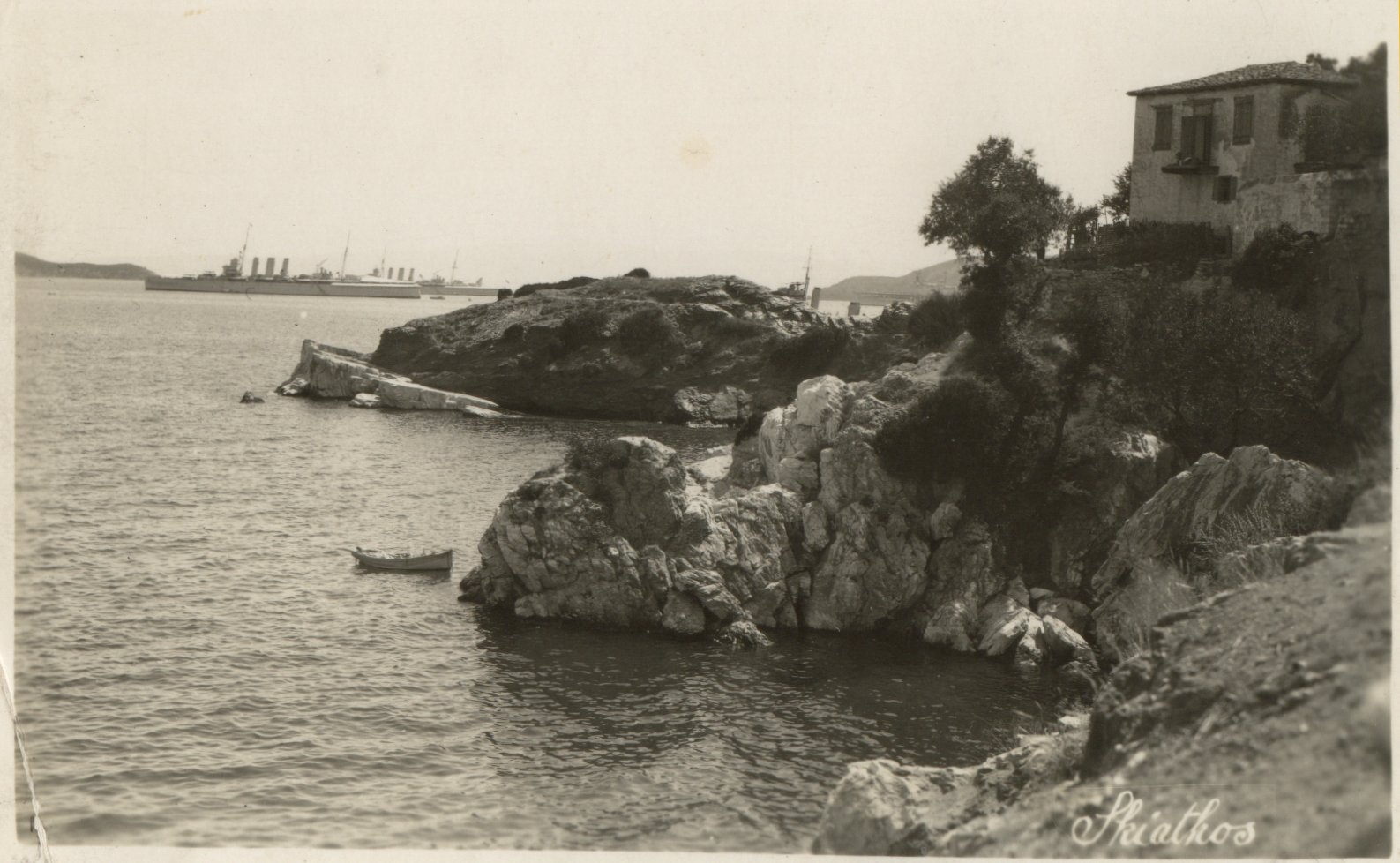 Shows views of Skiathos, which HMS London visited after the funerals on 27th and 29th July. In the bottom right picture can be seen two County Class cruisers, the aircraft carrier HMS Eagle, and a destroyer.