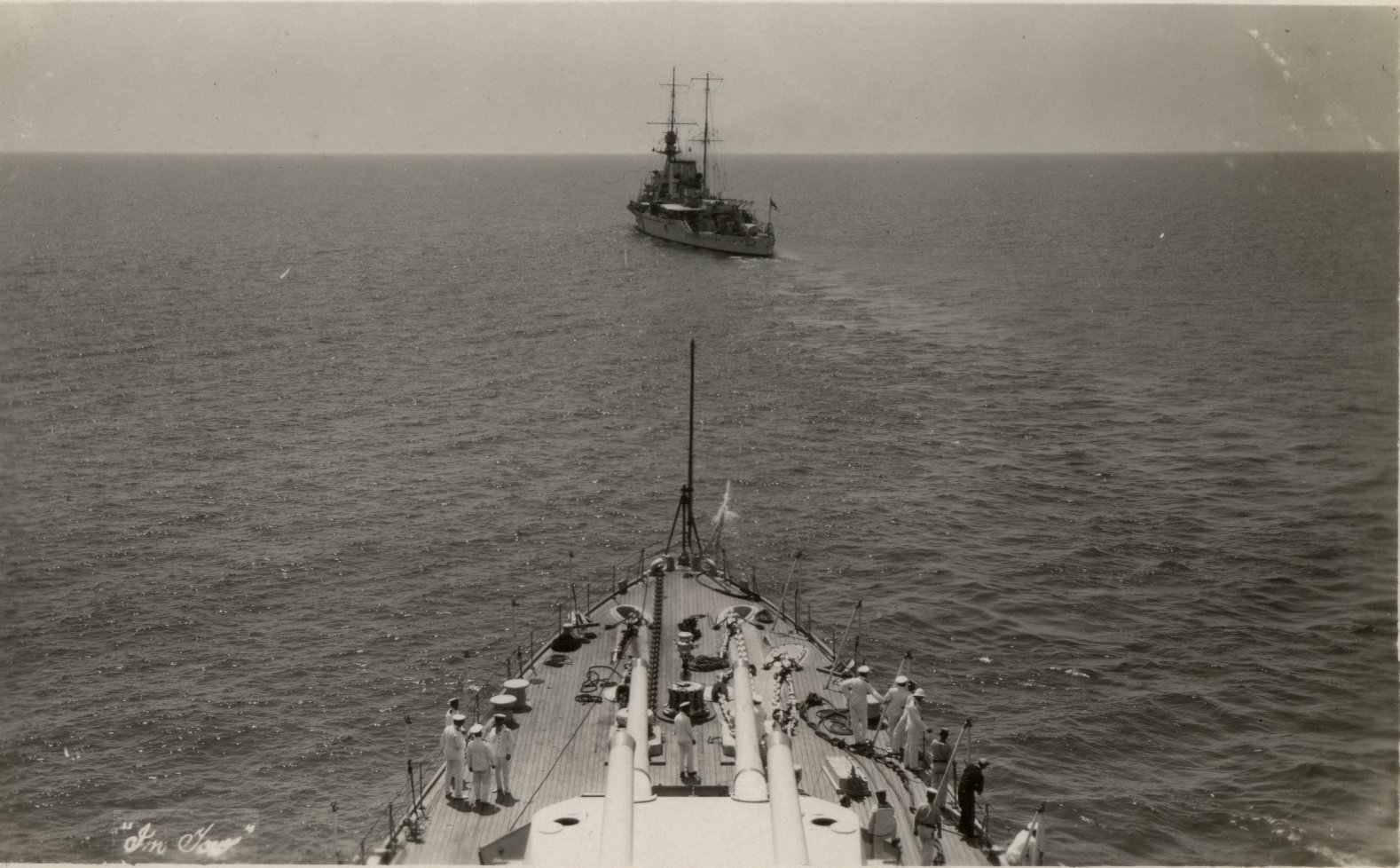 The fleet sailed at 7.30 a.m. under the orders of V.A.I. forming up in a single line of 92½ cables long and comprised of 41 ships in the order 1st B.S., 1st C.S., 3rd C.S., Cairo., 4th D.F, 1st D.F., 2nd D.F., Douglas., K26, and 2 "L" S/M's. Truly an imposing spectacle. The departing C in C, Sir Frederick L. Field in the "Warspite" (preceded by the "Bryony" with all the Nobility and Society of Malta on board) left harbour at 10 a.m, and passed down the whole of the line at a distance of 2 cables. Each ship gave the C in C. 3 cheers as he passed on his way home, and all flew the signal "Goodbye Good Luck". This was answered by "Thank you" from the Fleet Flagship. A really wonderful "send off".