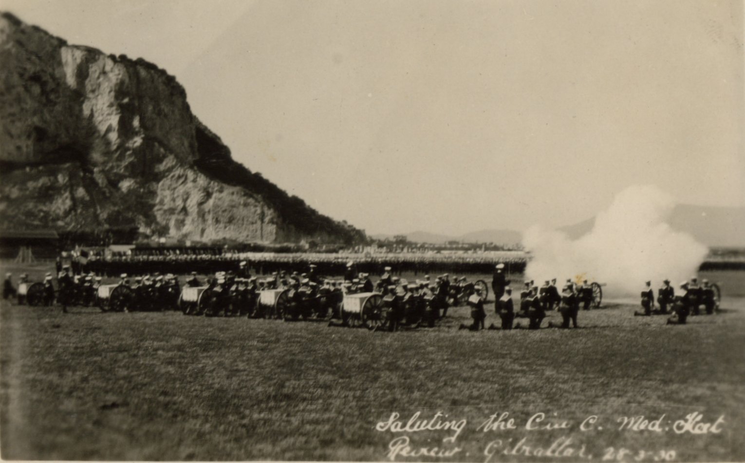 On 15th March the fleet left Palma for Gibraltar, arriving on 18th. On 28th March the Mediterranean Fleet Review was held on the North Front, Gibraltar. The pictures on this page show that review. The bottom right picture shows a view of La Linea in Spain across what was known as the Neutral Ground. Since Britain captured the Rock in 1704 the Spaniards had been besieging it, trying to recapture it and the names reflect this - La Linea was where the Spanish lines were, just out of gunshot in those days, and the Neutral Ground is self explanatory. It is now the Gibraltar airfield.