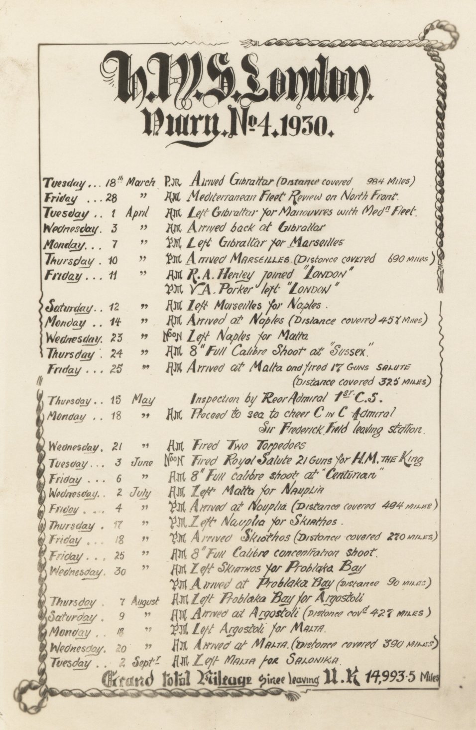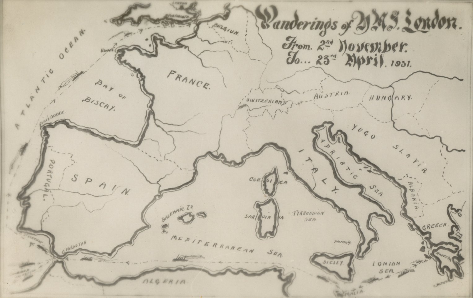Top left shows Rhodes at sunset. Top right appears to be a licensed cab, from the badge on the drivers lapel. Bottom left the ships cats. Two were named Ginger and Smigget. There is no record of kittens. The bottom right show the map of the wandering of HMS London. The 2nd November to 25th April 1931 show London disappearing off the map from Gibraltar. I can remember Dad talking of a visit to Madeira, so this must have been it.