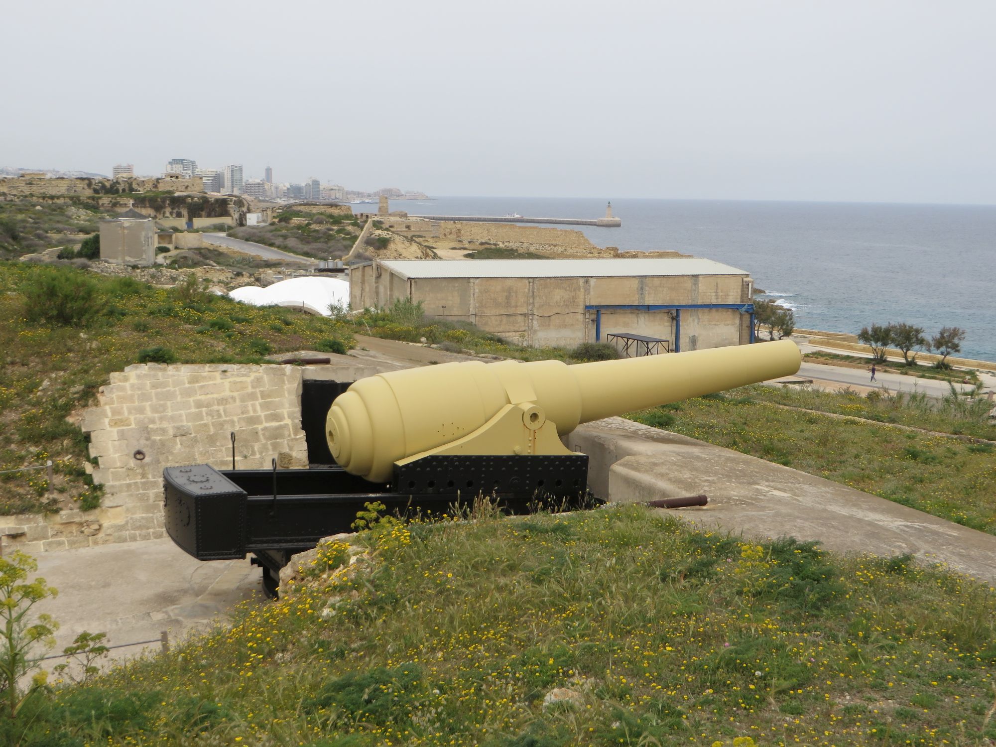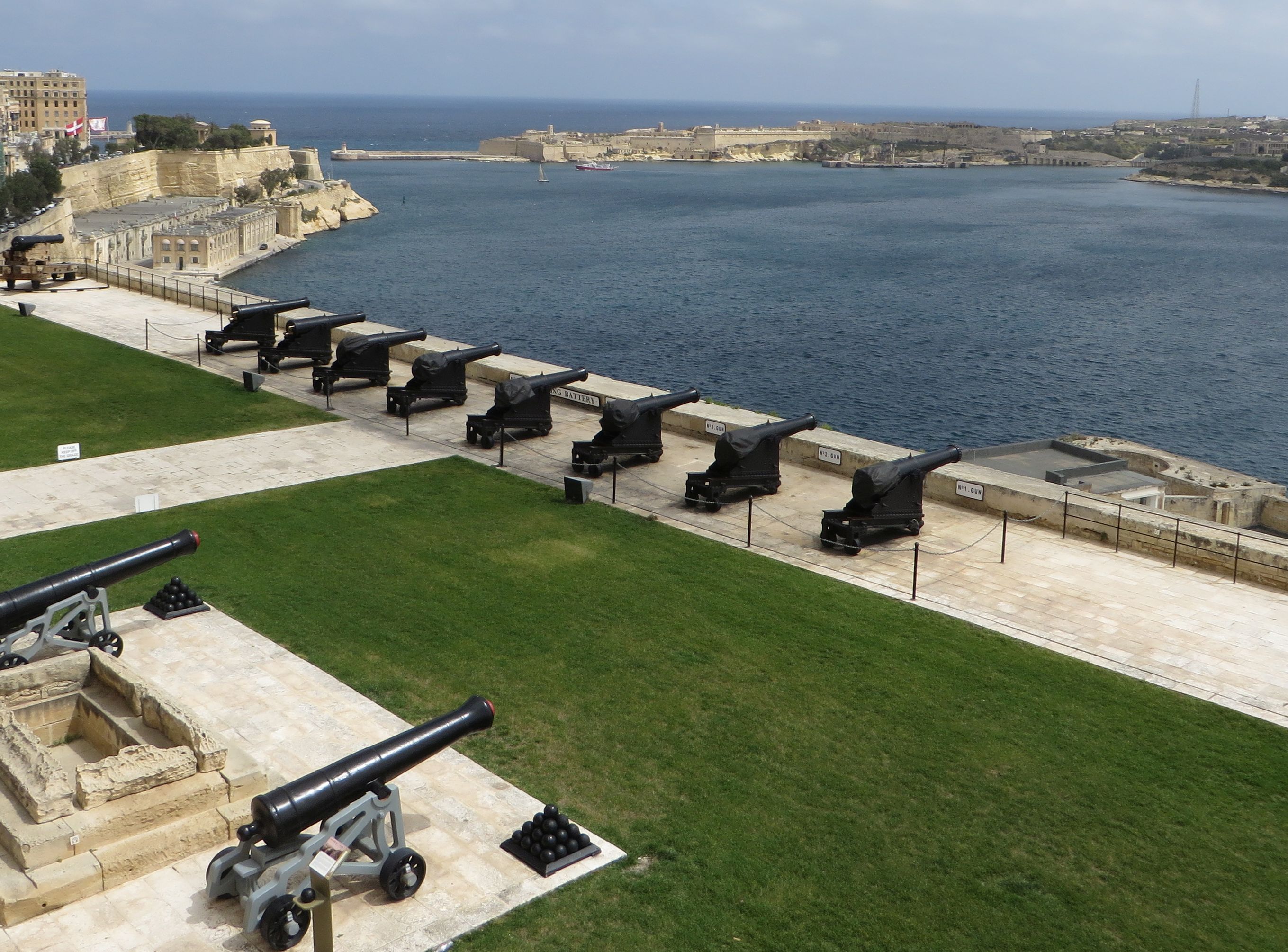 The top two pictures show views of Fort St Angelo and Dockyard Creek. In the top left can be seen a Queen Elizabeth Class battleship and an aircraft carrier, probably Courageous. Top right shows a County Class cruiser in Dockyard Creek. In the bottom left picture of Sliema can be seen a good view of a dgaissah (usually pronounced by the fleet as dyso). These boats were the normal way of getting ashore as nearly all the ships were tied up in the harbour and it saved the ships' boats a lot of wear and tear as well as providing a living for quite a lot of people. The bottom right picture has quite an interesting history. In the 1870's Armstrong built a 100 ton gun that outperformed any other gun then in use. The Admiralty turned it down but Italy took it up and built two battleships, the Duilio and the Dandolo, each carrying four of these guns. The Admiralty suddenly realised that the Italians could, if they wanted to, destroy Malta and Gibraltar without any British gun being able to prevent them. To counter this they bought four of these guns, two for Malta and two for Gibraltar. This is the surviving one at Malta, which protected Grand Harbour. The other protected Sliema Creek. One of the Gibraltar guns also survives.